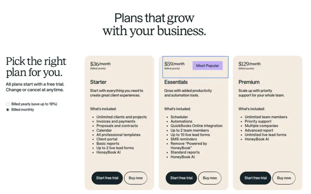 HoneyBook’s 3 plans each support different business growth stages. Whether you’re looking to get organized, take on more clients, or scale a more extensive operation, there’s a plan designed to meet your goals.