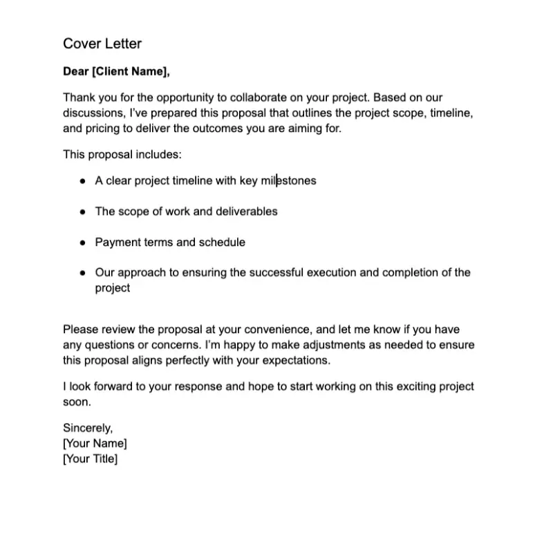 The cover letter is a critical part of your proposal. It provides an introduction to the project, sets the tone for the document, and gives a brief overview of what the proposal includes. The cover letter should be professional, clear, and concise.